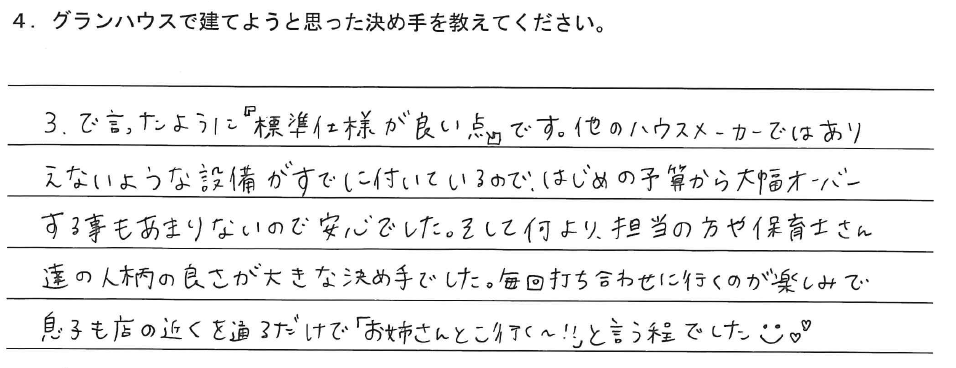 3で言ったように『標準仕様が良い点』です。他のハウスメーカーではありえないような設備がすでに付いているので、はじめの予算から大幅オーバーする事もあまりないので安心でした。そして何より、担当の方や保育士さん達の人柄の良さが大きな決め手でした。毎回打ち合わせに行くのが楽しみで息子も店の近くを通るだけで「お姉さんのとこ行く~!!」と言う程でした♡