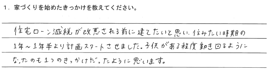住宅ローン減税が改悪される前に建てたいと思い、住みたい時期の1年~1年半より計画スタートさせました。子供がある程度動き回るようになったのも1つのきっかけだったように思います。