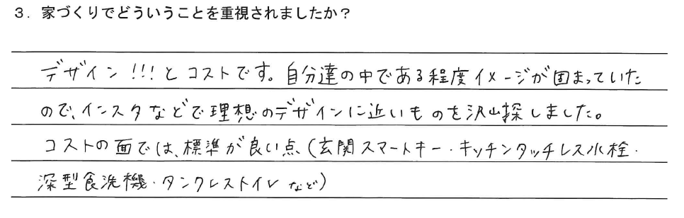 デザイン!!!とコストです。自分達の中である程度イメージが固まっていたので、インスタなどで理想のデザインに近いものを沢山探しました。コストの面では、標準が良い点(玄関スマートキー、キッチンタッチレス水栓、深型食洗器、タンクレストイレなど)