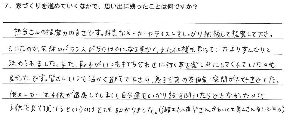 担当さんの提案力の良さです。好きなメーカーやテイストをしっかり把握して提案して下さっていたので、全体のバランスがちぐはぐになる事なく、また仕様も思っていたよりすんなりと決められました。また、息子がいつも打ち合わせに行く事を楽しみにしてくれていたのも良かったです。皆さんいつも温かく迎えて下さり、息子もあの雰囲気・空間が大好きでした。他メーカーは子供が退屈してしまい、自分達もしっかり話を聞いたりできなかったので、子供を見て頂けるというのはとても助かりました。(保育士さん達皆さん、かわいくて美人さん多いです♡)
