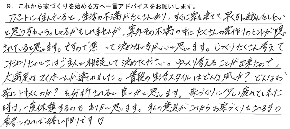 9.これから家づくりを始める方へ一言アドバイスをお願いします。
