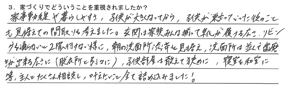 家事動線や暮らしやすさ、子供が大きくなってから、子供が巣立っていった後のことも見据えての間取りを考えました。玄関は家族みんな揃って靴が履ける広さリビングを通らないと2階へ行けない様に、朝の洗面所渋滞を見据え、洗面所は並んで歯磨きが出来る広さに(脱衣所と別々に)、子供部屋は敢えて狭めに、寝室を和室に等、主人とたくさん相談し、叶えたいこと全て詰め込みました!