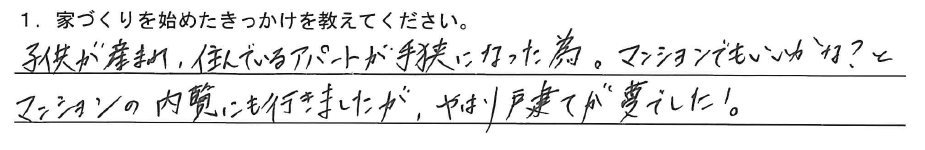 子供が産まれ、住んでいるアパートが手狭になった為。マンションでもいいかな?とマンションの内観にも行きましたが、やはり戸建てが夢でした!