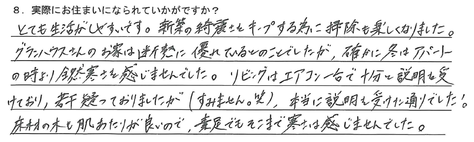 とても生活がしやすいです。新築の綺麗さをキープする為に掃除も楽しくなりました。グランハウスさんのお家は断熱に優れているとのことでしたが、たしかに冬はアパートの時より全然寒さを感じませんでした。リビングはエアコン一台で十分と説明を受けており、若干疑っておりましたが(すみません。笑)、本当に説明を受けた通りでした!床材の木も肌あたりが良いので、素足でも寒さは感じませんでした。