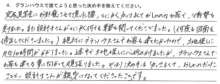 完成見学会にお邪魔させて頂いた際に、とにかくカッコよくておしゃれなお家で、衝撃を受けました。また、設計士さんがとにかく何でも要望を聞いてくださいました。(何度も図面を修正してくださいました。) 絶対にグランハウスさんでお家を建てたかったので、土地探しにかなりの時間がかかりました。途中で土地探しに心折れかけましたが、グランハウスさんでお家を建てる夢に向かって頑張りました。やはり決め手は「かっこよくて、おしゃれだったことと、設計士さんが親身になってくださったこと」です。