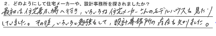 最初は住宅展示場へ行き、いろいろな住宅メーカーさんのモデルハウスを見たりしていました。その後、いろいろと勉強して、設計事務所の存在を知りました。
