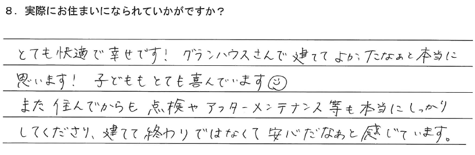 とても快適で幸せです!グランハウスさんで建ててよかったなぁと本当に思います!子どももとても喜んでいます!また住んでからも点検やアフターメンテナンス等も本当にしっかりしてくださり、建てて終わりではなくて安心だなぁと感じています。