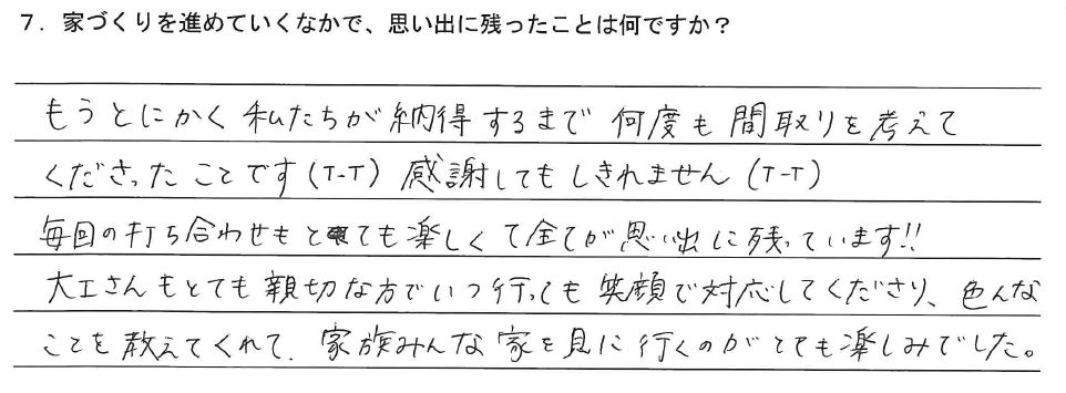 7.家づくりを進めていくなかで、思い出に残ったことは何ですか?