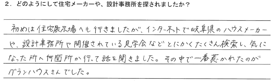 初めは住宅展示場へも行きましたが、インターネットで岐阜県のハウスメーカーや、設計事務所や開催されている見学会などとにかくたくさん検索し、気になった所へ何箇所か行って話を聞きました。その中で一番惹かれたのがグランハウスさんでした。