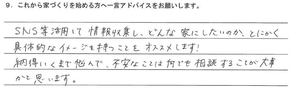 9.これから家づくりを始める方へ一言アドバイスをお願いします。