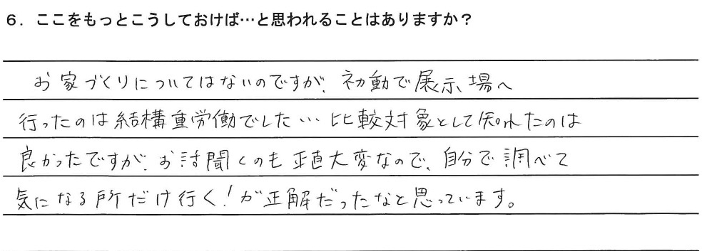 お家づくりについてはないのですが、初動で展示場へ行ったのは結構重労働でした…比較対象として知れたのは良かったですが、お話聞くのも正直大変なので、自分で調べて気になる所だけ行く!が正解だったなと思っています。