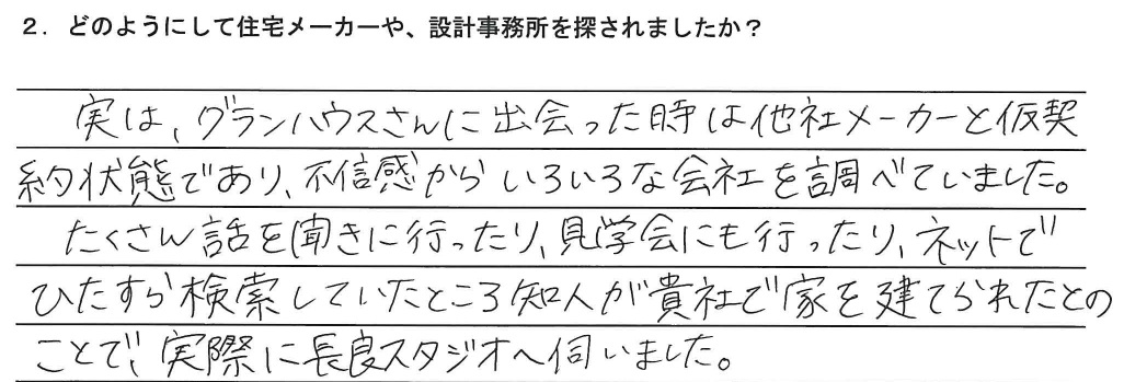 実は、グランハウスさんに出会った時は他社メーカーと仮契約状態であり、不信感からいろいろな会社を調べていました。たくさん話を聞きに行ったり、見学会にも行ったり、ネットでひたすら検索していたところ知人が貴社で家を建てられたとのことで、実際に長良スタジオへ伺いました。