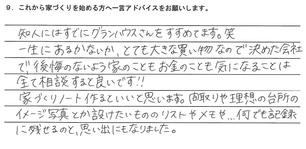 9.これから家づくりを始める方へ一言アドバイスをお願いします。