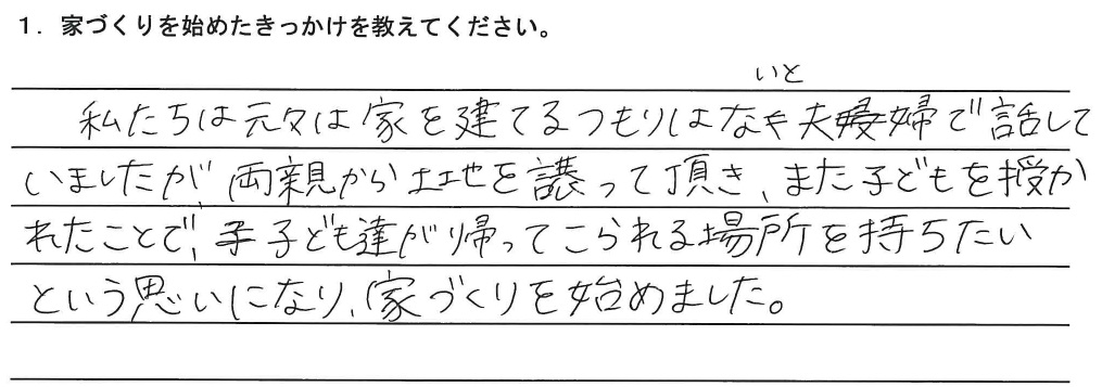 私たちは元々は家を建てるつもりはないと夫婦で話していましたが、両親から土地を譲って頂き、また子どもを授か
