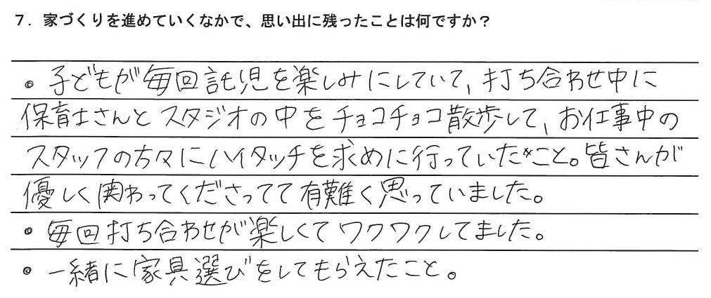 7.家づくりを進めていくなかで、思い出に残ったことは何ですか?