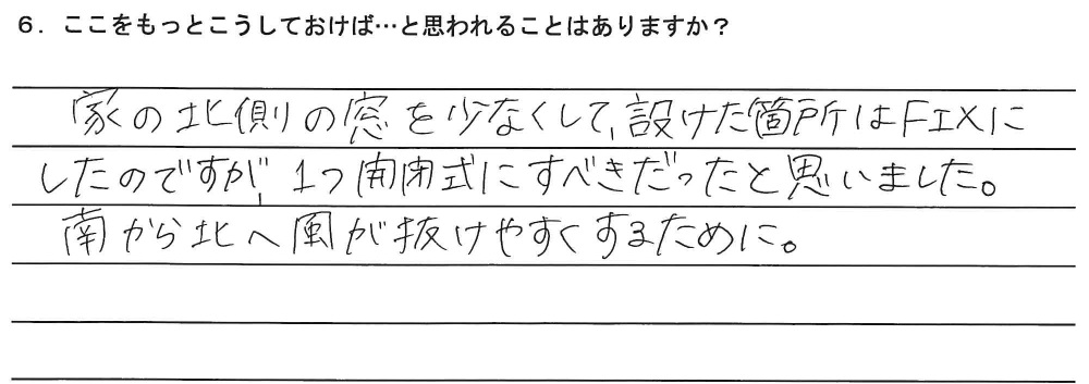 家の北側の窓を少なくして、設けた箇所はFIXにしたのですが、1つ開閉式にすべきだったと思いました。南から北へ風が抜けやすくするために。