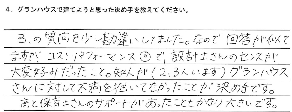 3.の質問を少し勘違いしてました。なので回答が似てますが、コストパフォーマンス◎で、設計士さんのセンスが大変好みだったこと。知人が(2.3人います)グランハウスさんに対して不満を抱いてなかったことが決め手です。あと保育士さんのサポートがあったこともかなり大きいです。
