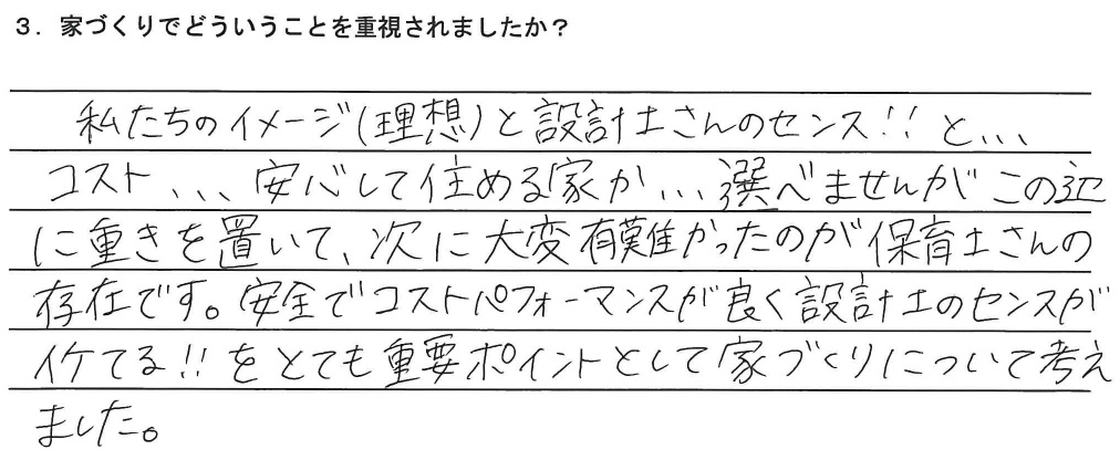 私たちのイメージ(理想)と設計士さんのセンス!!と、、、コスト、、、安心して住める家か、、、選べませんがこの辺に重きを置いて、次に大変有難かったのが保育士さんの存在です。安全でコストパフォーマンスが良く設計士のセンスがイケてる!!をとても重要ポイントとして家づくりについて考えました。