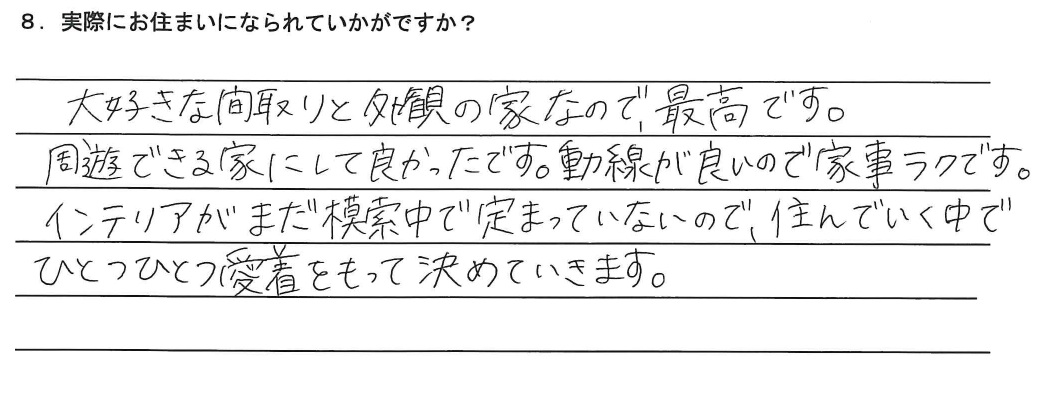 大好きな間取りと外観の家なので、最高です。周遊できる家にして良かったです。動線が良いので家具ラクです。インテリアがまだ模索中で定まっていないので、住んでいく中でひとつひとつ愛着をもって決めていきます。