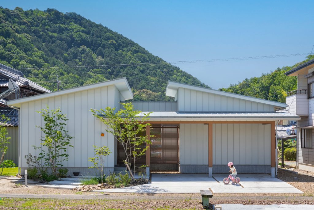 大きな切妻の平屋。和になりすぎないよう勾配を低くしてモダンな印象を加えた。