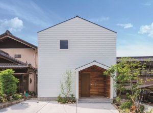 お施主様が好きな淡いブルーを随所に散りばめた平屋。間口の広さに合わせて2BOXにデザインした外観は、白×ブルー×木目の色合いと三角屋根の組み合わせでかわいらしさを演出した。周辺の状況と、一緒に暮らすうさぎの安全を考慮してご提案したロの字の間取りが、周囲からの視線カットと安定した採光を実現。暮らしやすさだけではなく、隠し扉やR壁のトイレなど遊び心のあるお家が完成した。
