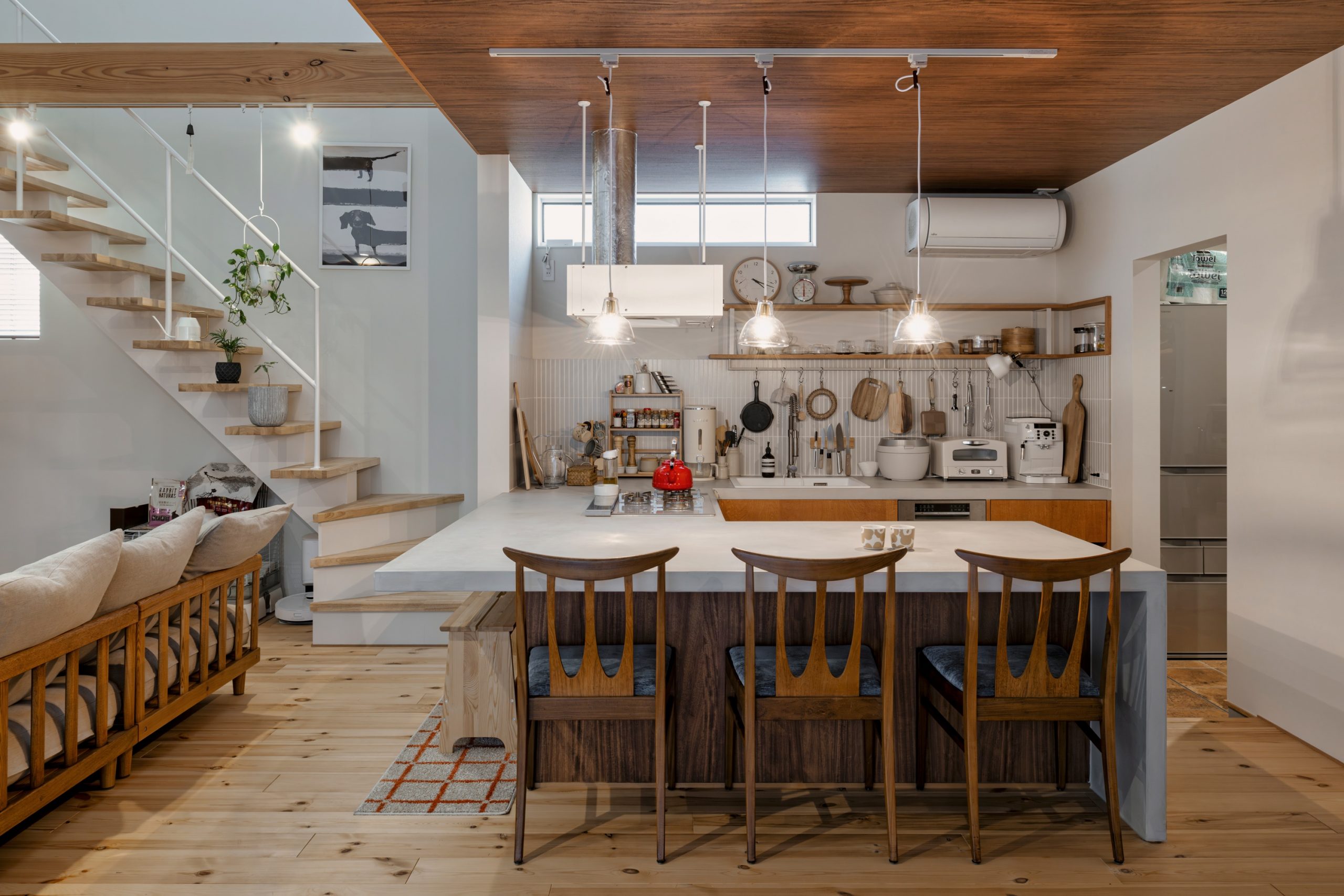ダイニングテーブルと一体のL字キッチンは、レンジフードを浮かせてすっきりとした印象に。作業台の下は隠す収納として、壁面に設けた飾り棚は飾る収納として楽しめる。