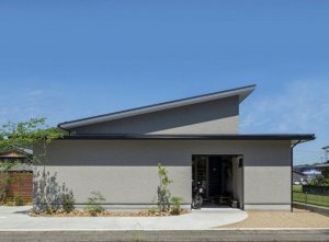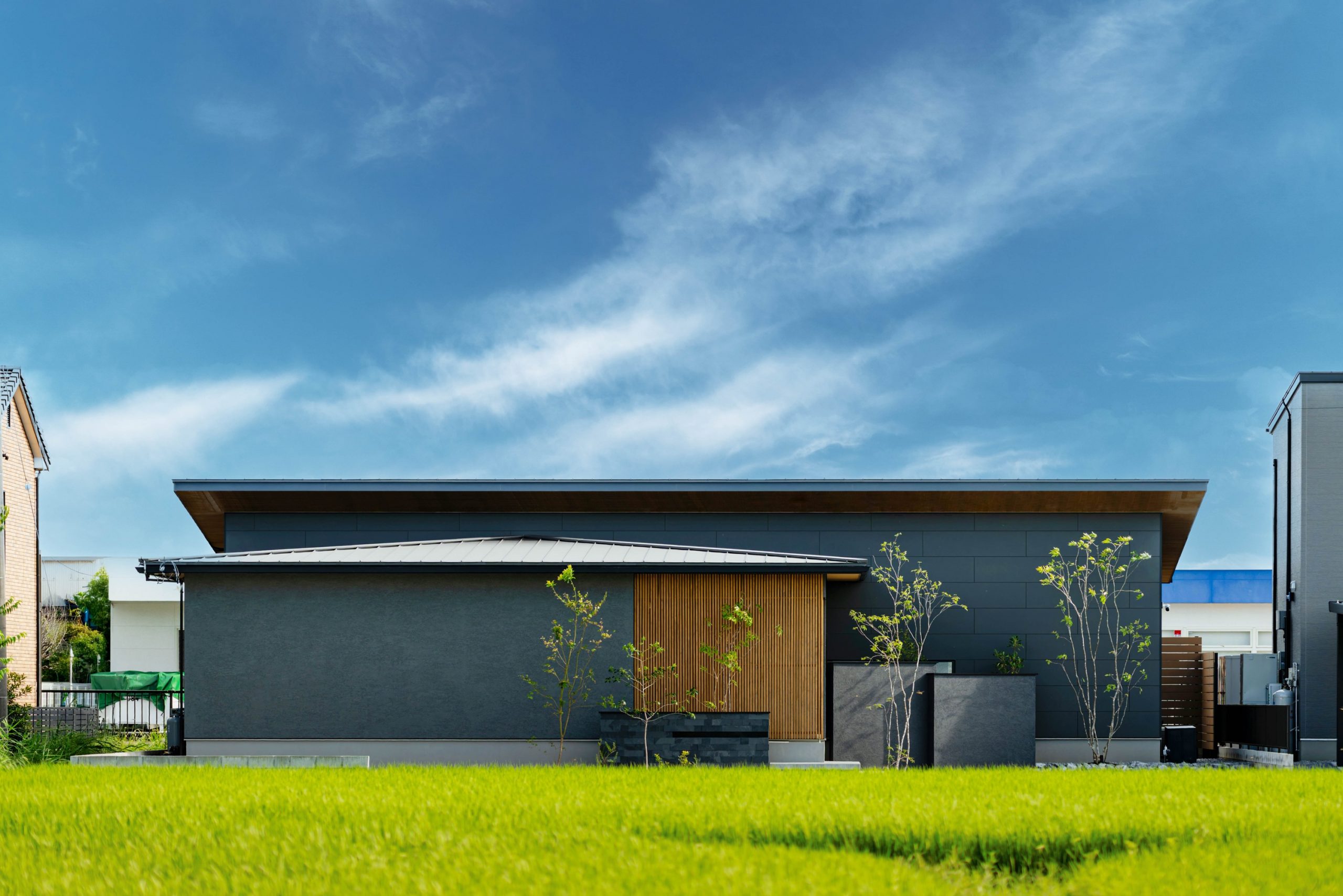 屋根の水平ラインを意識して設計した、重心の低い外観。黒×黒の配色で統一し、落ち着きのある佇まいに仕上げた。軒天まで伸びる格子の木目が和の趣を添える。