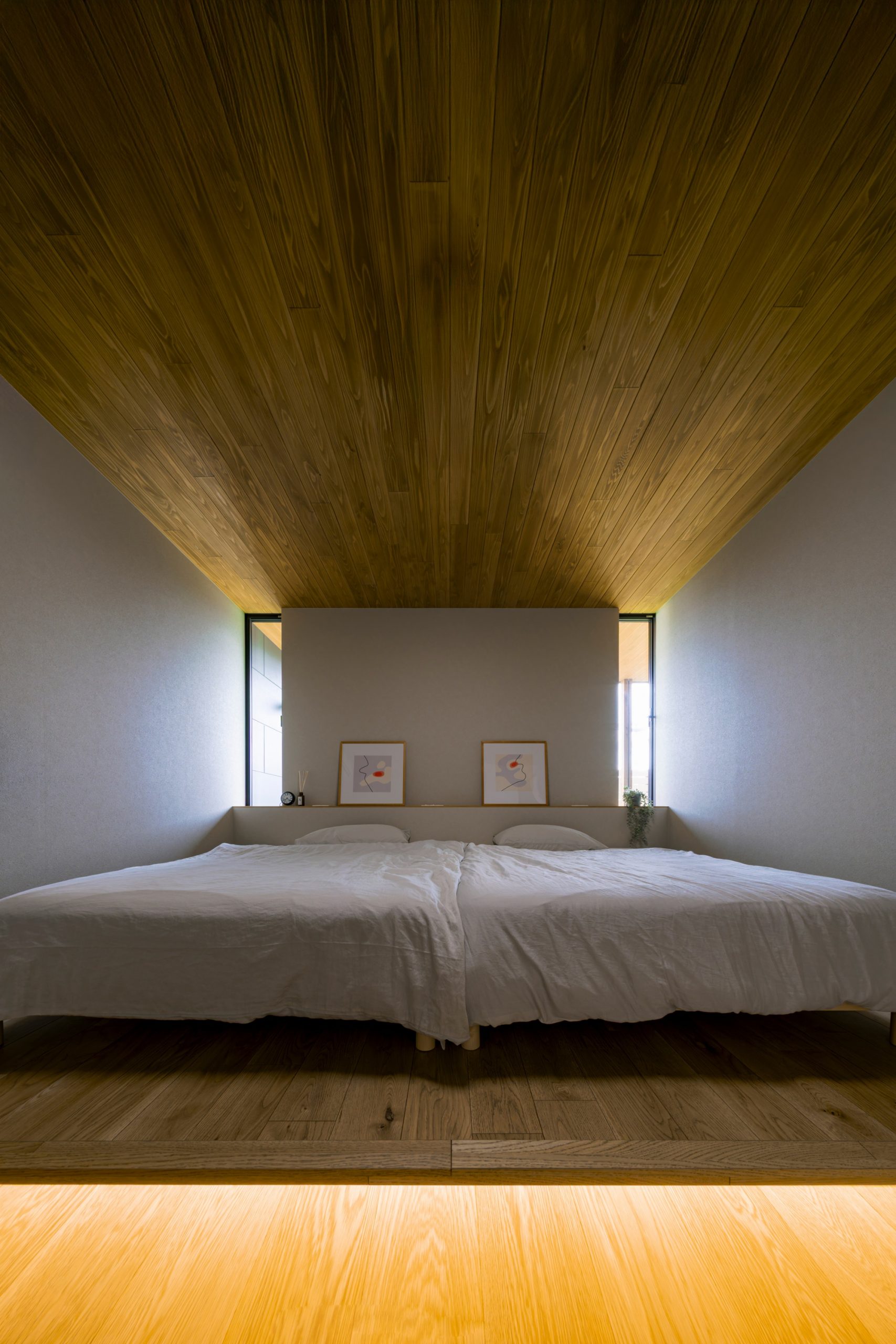 グレーの壁紙と小上がりの間接照明が織りなす上質な主寝室は、一日の疲れをゆったりと癒してくれる穏やかな空間。
