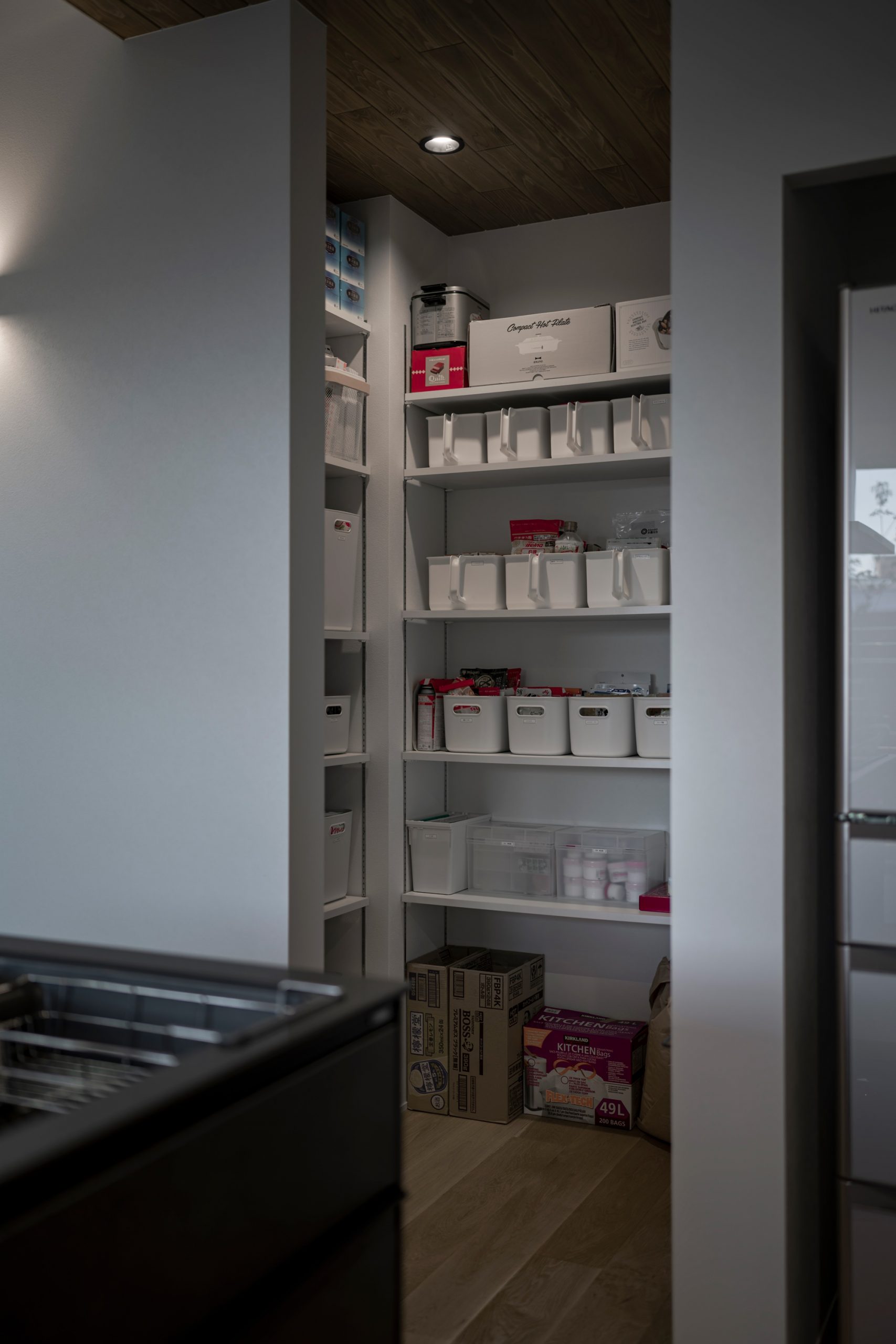 テレビ裏一面に設けた可動棚は、お子様の玩具やリビング用品の収納として活用できる。