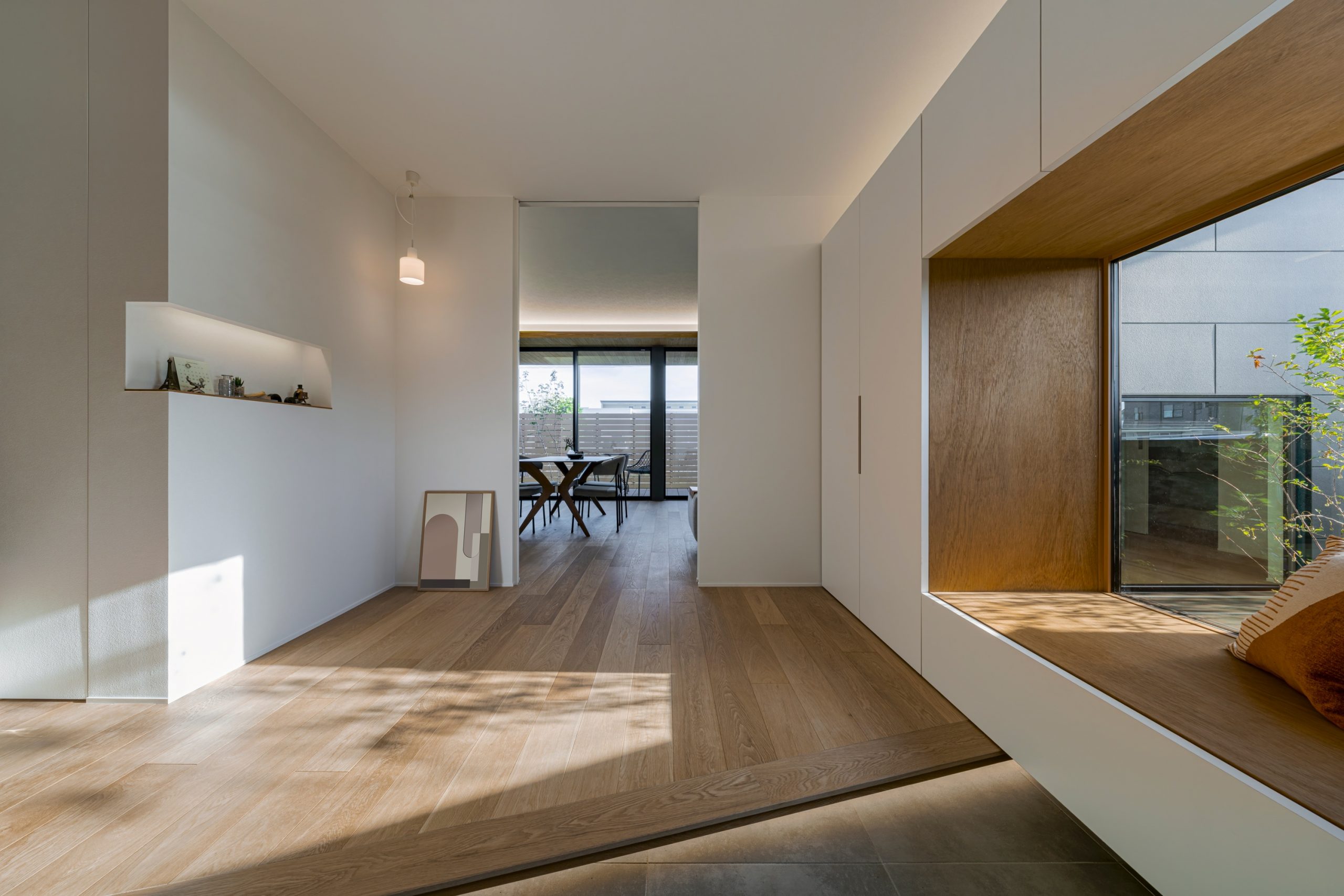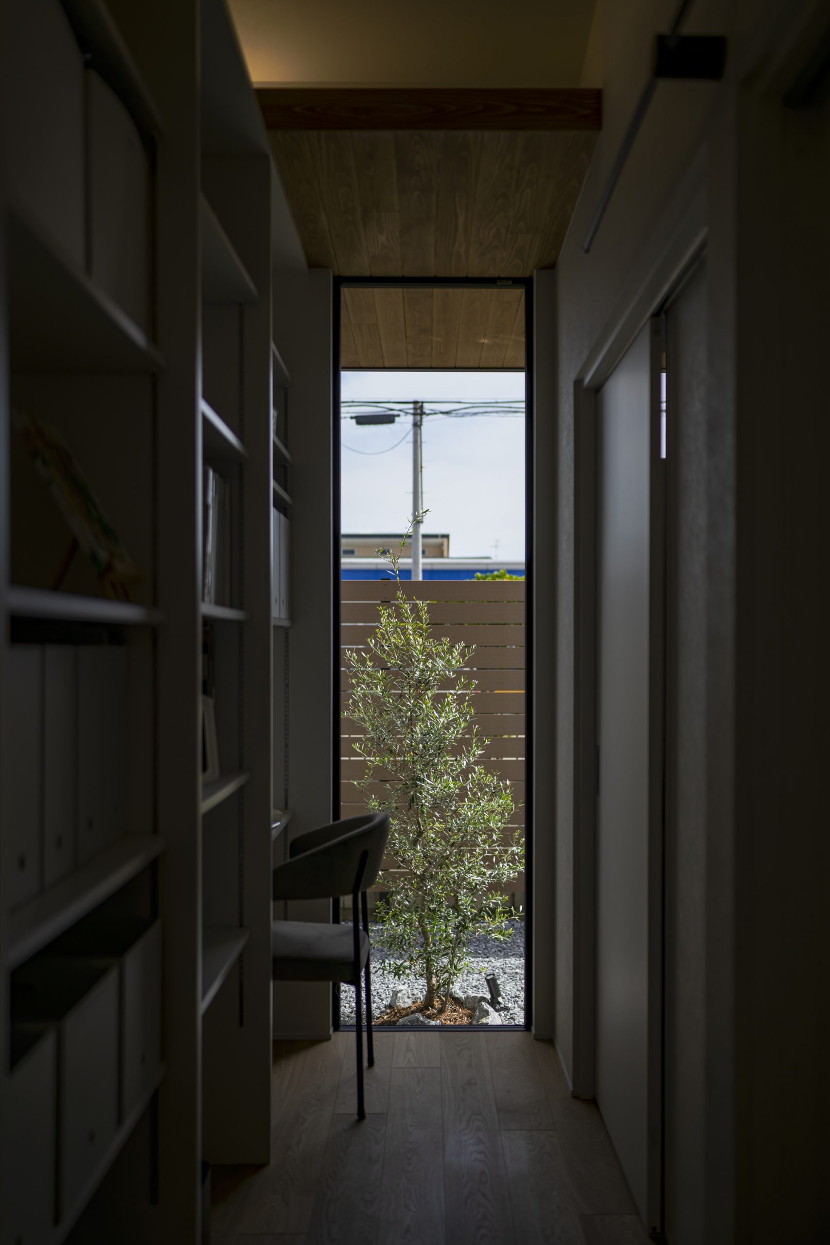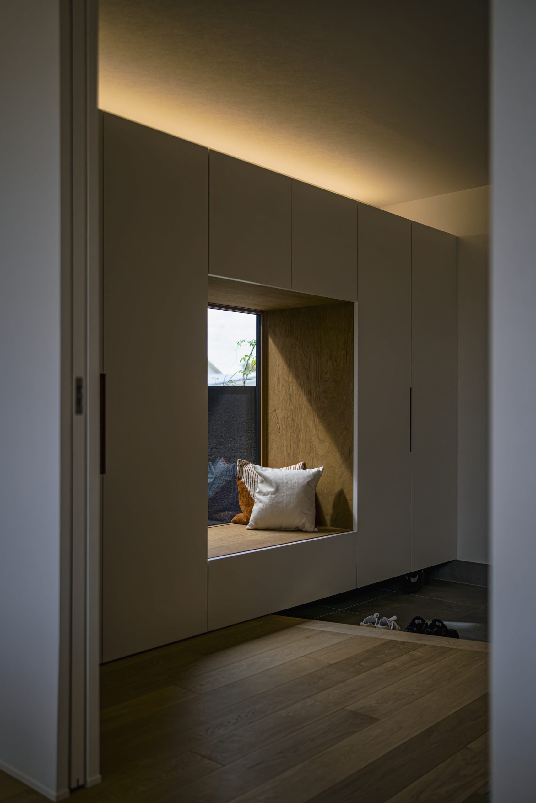 壁面収納の一部に窓を設け、収納の幅を活かしてヌックスペースをデザイン。植栽の合間から柔らかく差し込む光が心地よい。