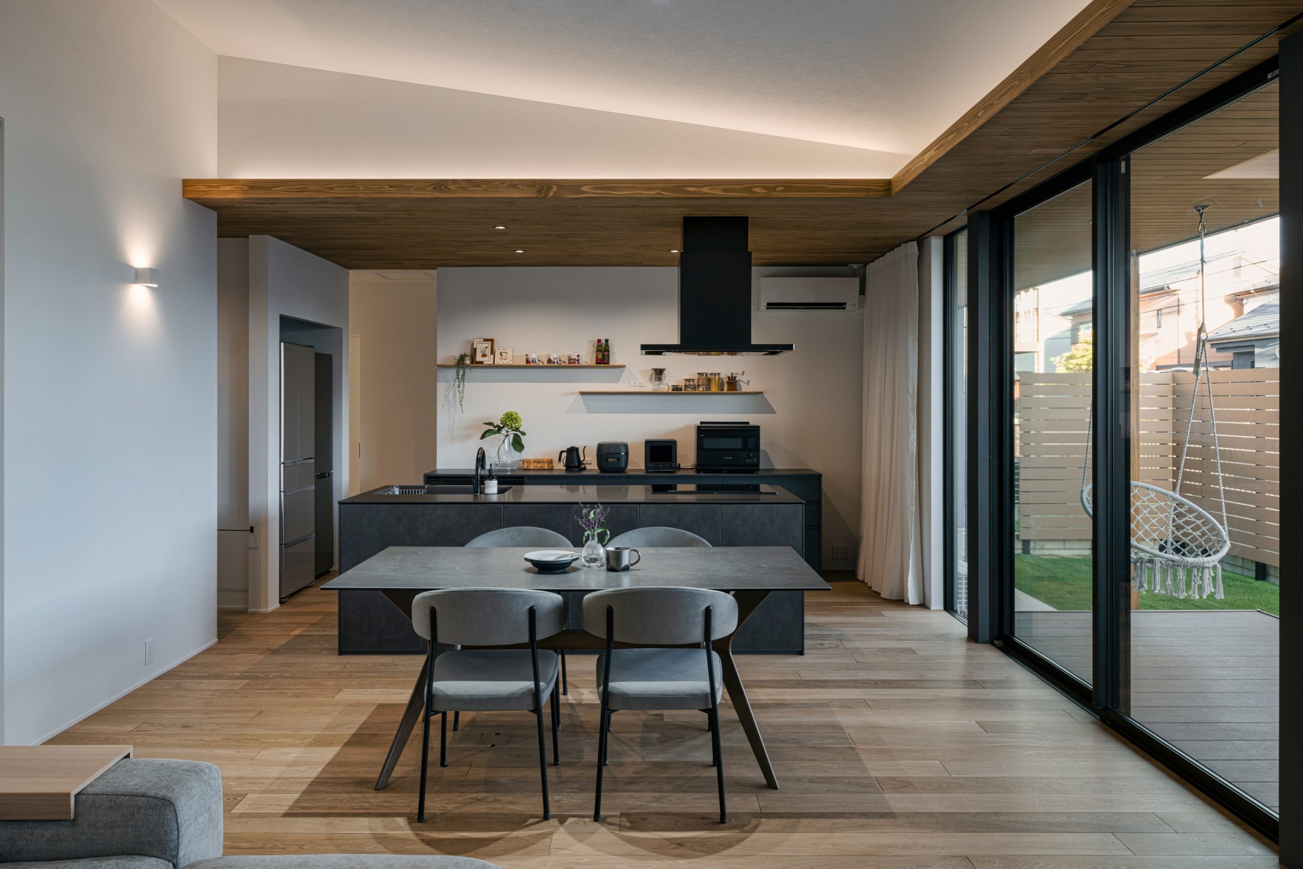 長く住まうからこそ、時を重ねても飽きのこない家を目指して設計した平屋。家族が自然とリビングに集まりたくなるような、居心地の良さと動線のつながりにこだわった。大開口サッシの先には、室内から連なる杉板の軒天と、床と高さを揃えたウッドデッキが広がる。内と外との境界を曖昧にし、外までもがリビングの延長のように感じられる開放的を実現した。広々とした空間だからこそ映える600角の大判タイルが、リビングに上質な重厚感をもたらす。落ち着いたカラーと上質な素材を組み合わせた、オーセンティックな平屋が完成した。