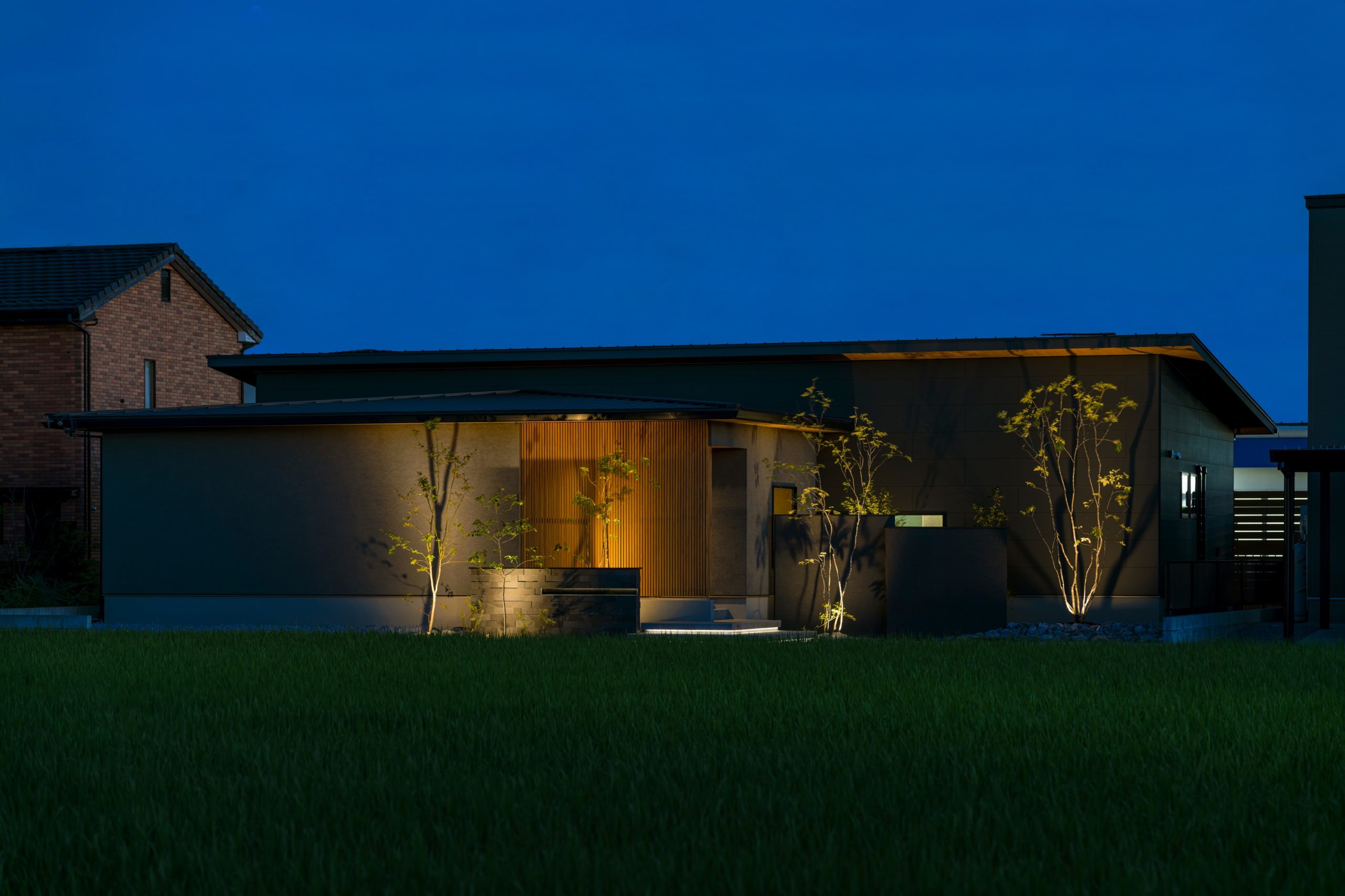 晩景は、外構の照明計画によって木目の温かみが引き立つ。