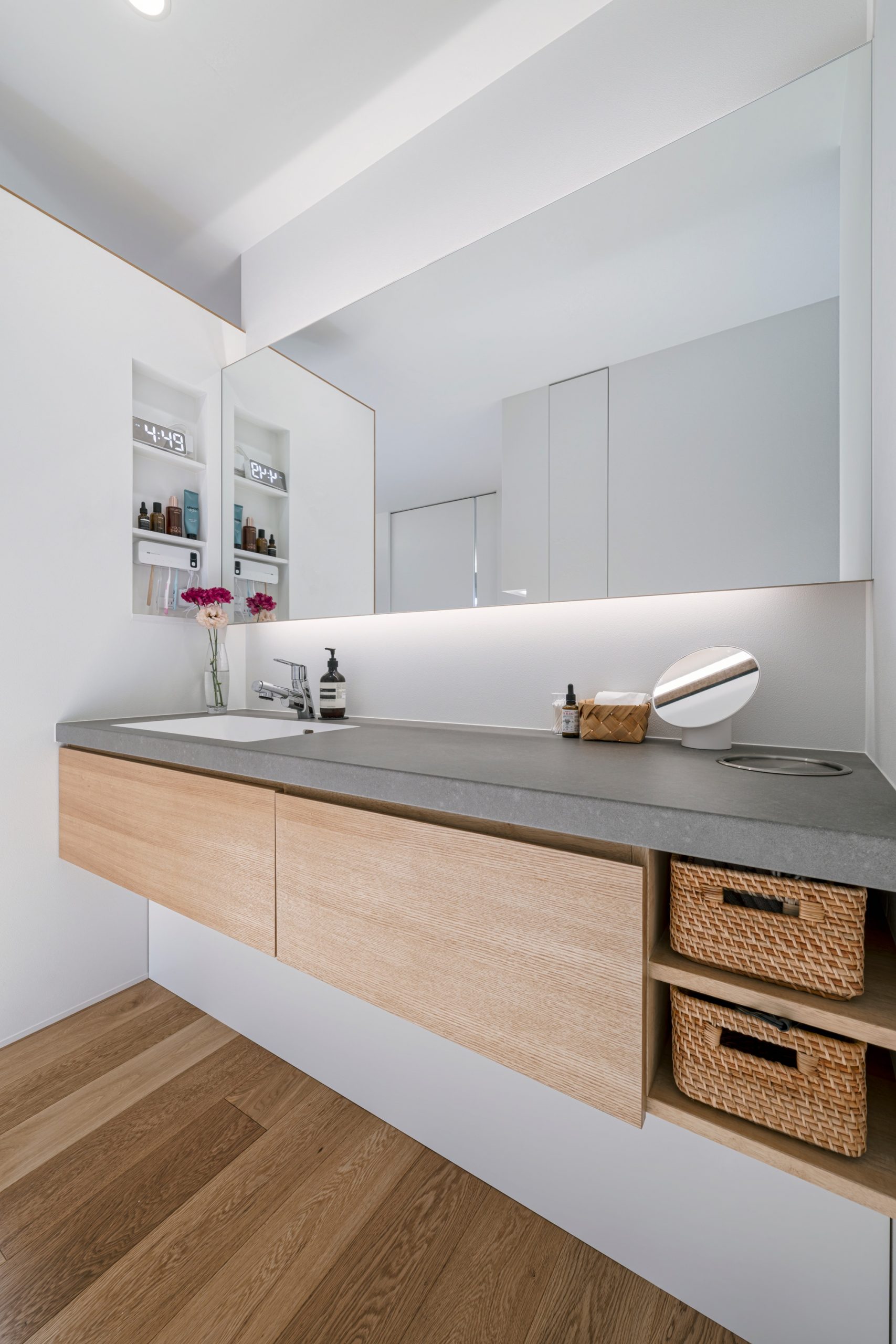玄関横に配置した洗面は、帰宅後すぐに使える“ただいま手洗い”としても活躍。ダストシュートを組み込むことで、生活感を抑えてすっきり保つことができる。