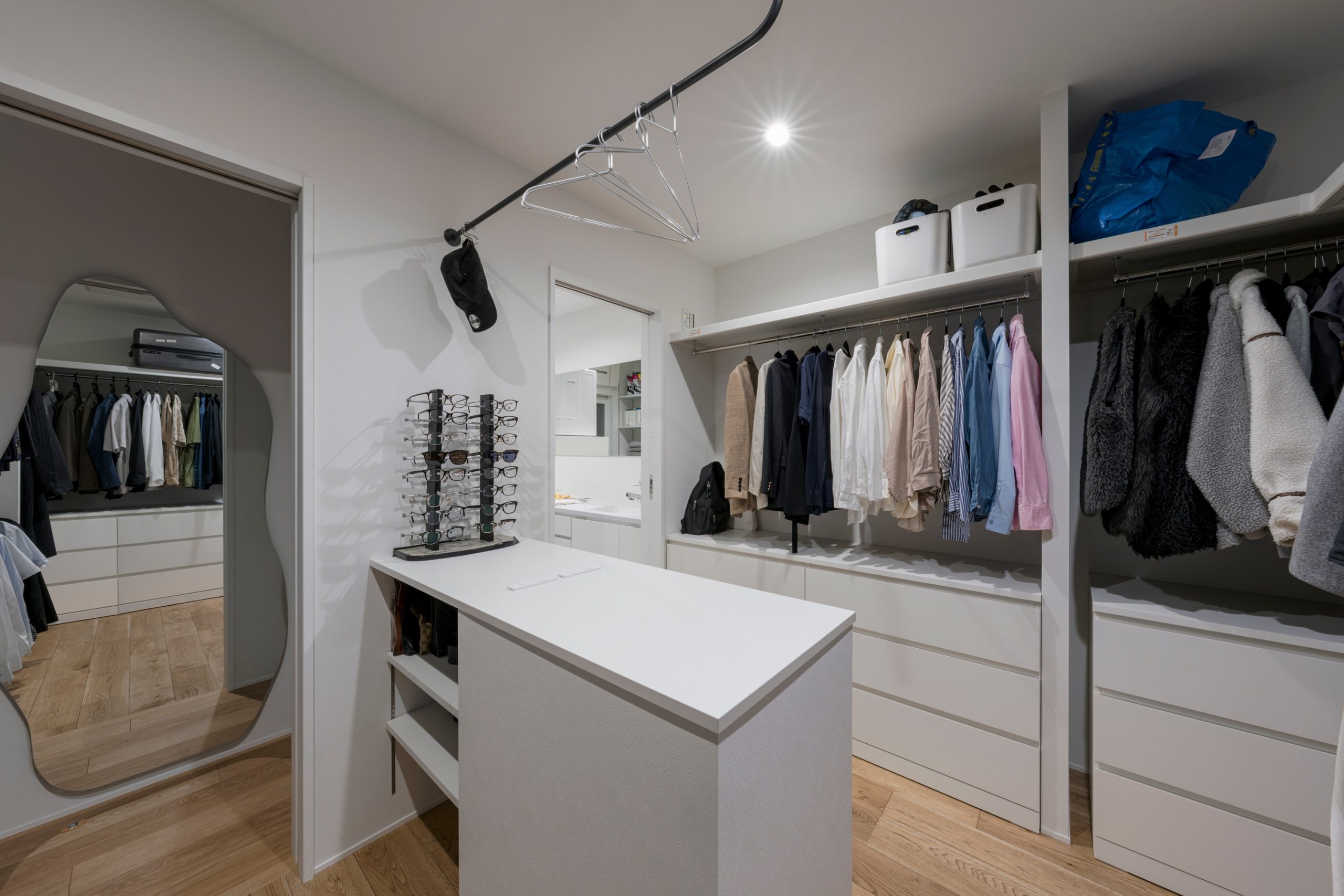 脱衣兼ランドリーと隣接させたウォークインクローゼットの中心には、収納兼作業台を設置。畳んだ洗濯物をそのまま同室に片付けられる動線の短さを実現した。