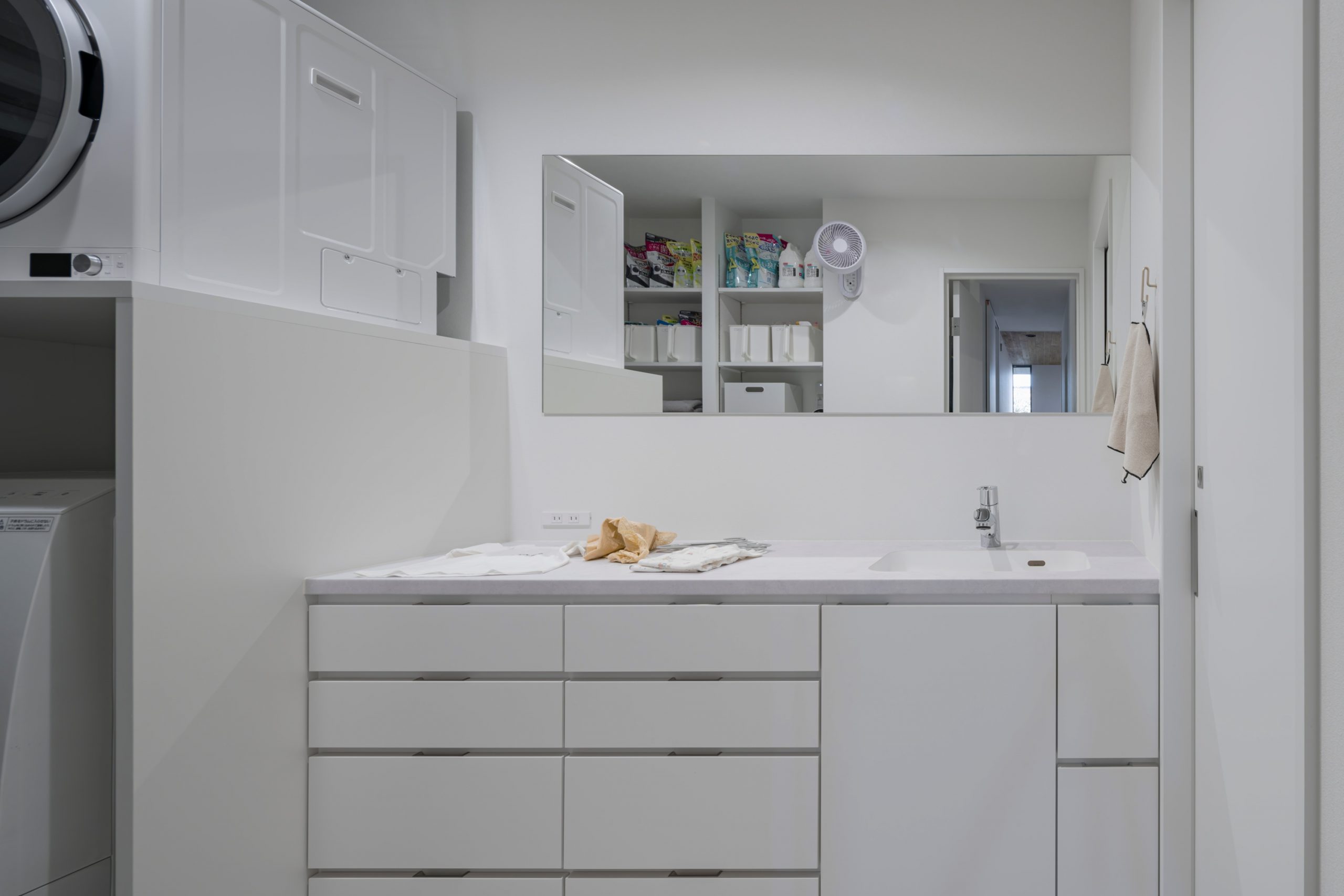 つけ置き洗いやお風呂上がりのスキンケアができるよう、脱衣兼ランドリースペースにも洗面台を設けた。