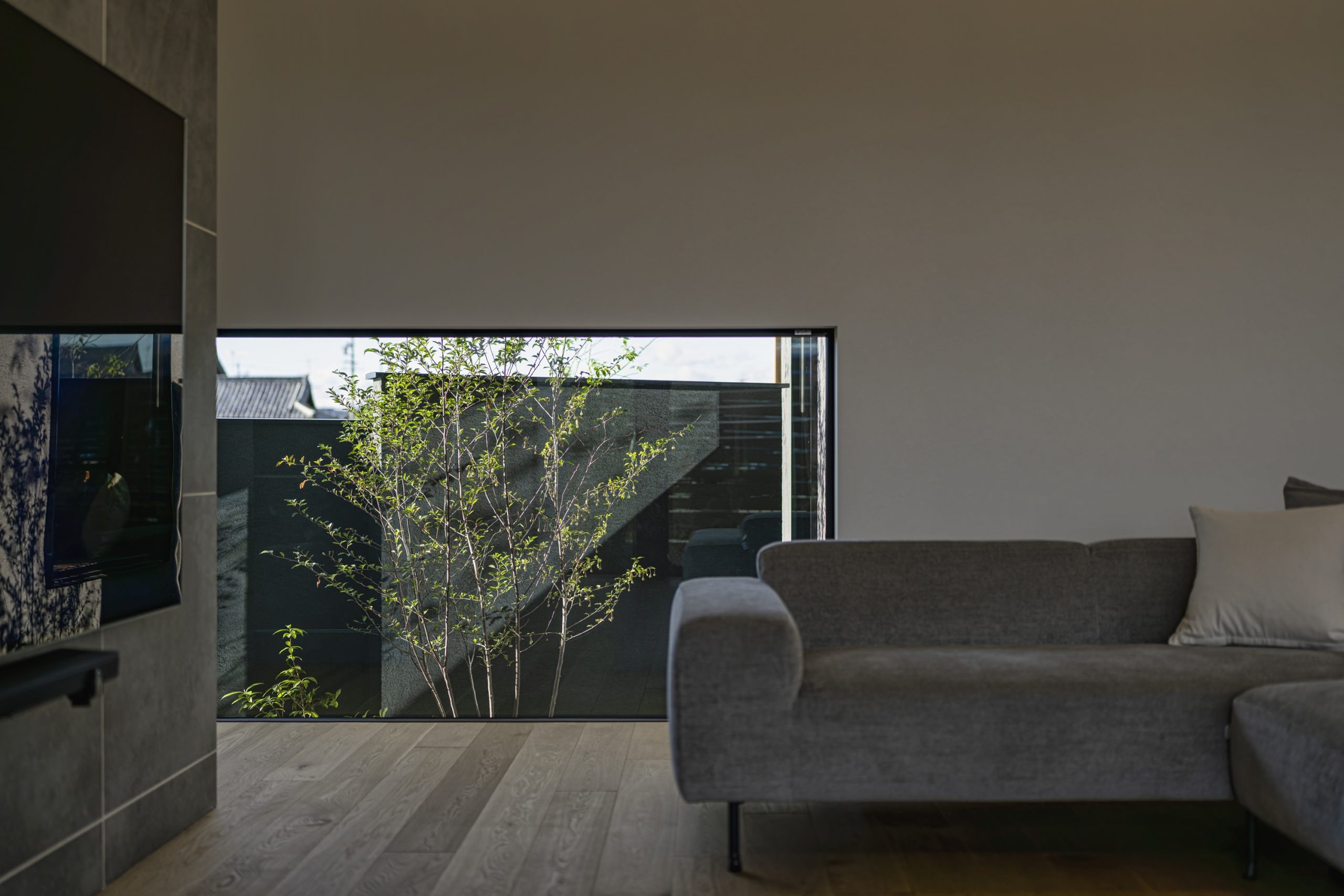 ソファからの眺めにもこだわり、光の入り方や視線の抜けを計算して窓を配置。やわらかな光と緑を取り込みながらも、前面道路からの視線を感じさせないよう設計した。