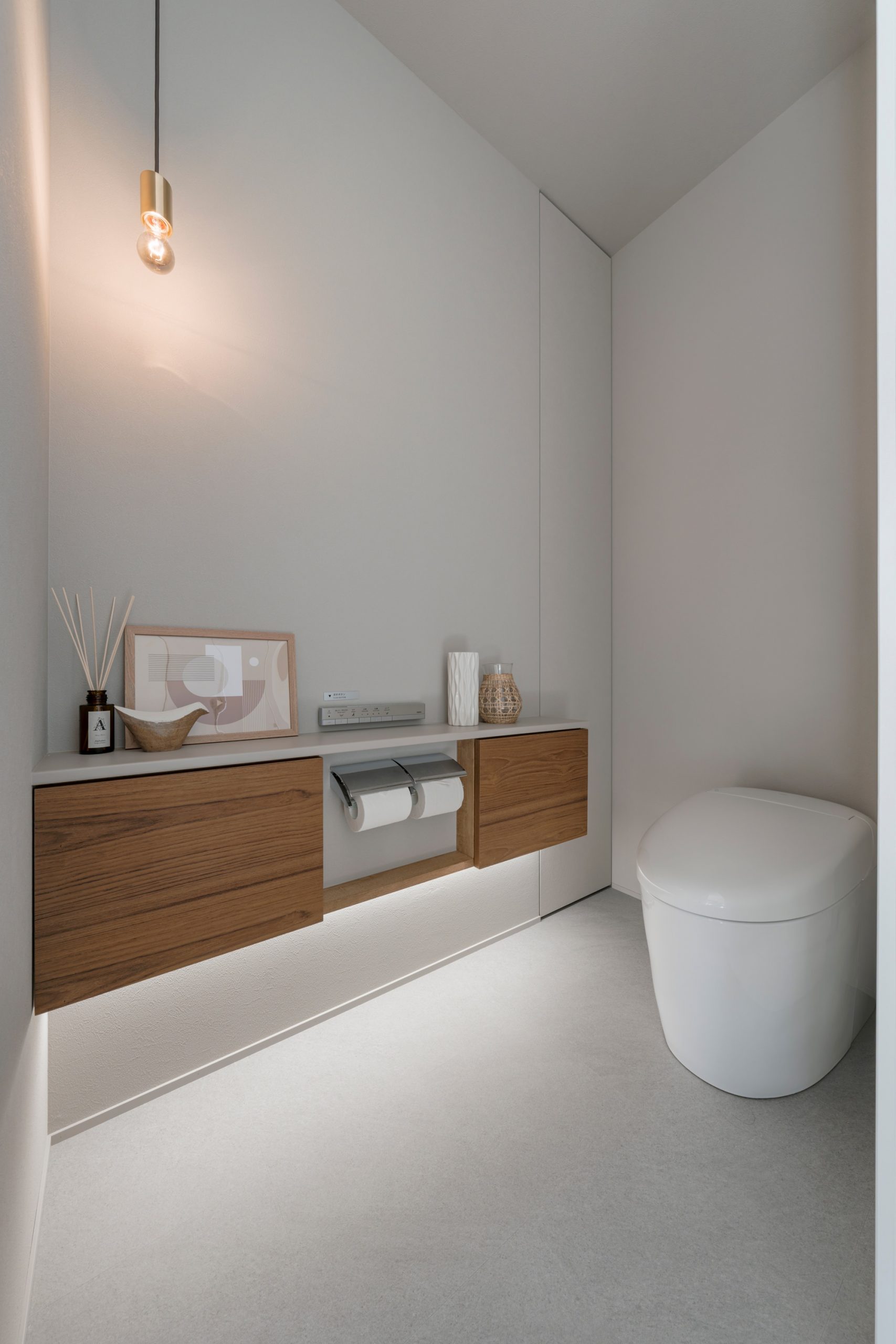 グレーと木目を組み合わせた落ち着きあるトイレ。カウンター奥には隠し扉の収納を忍ばせ、端正な印象に。