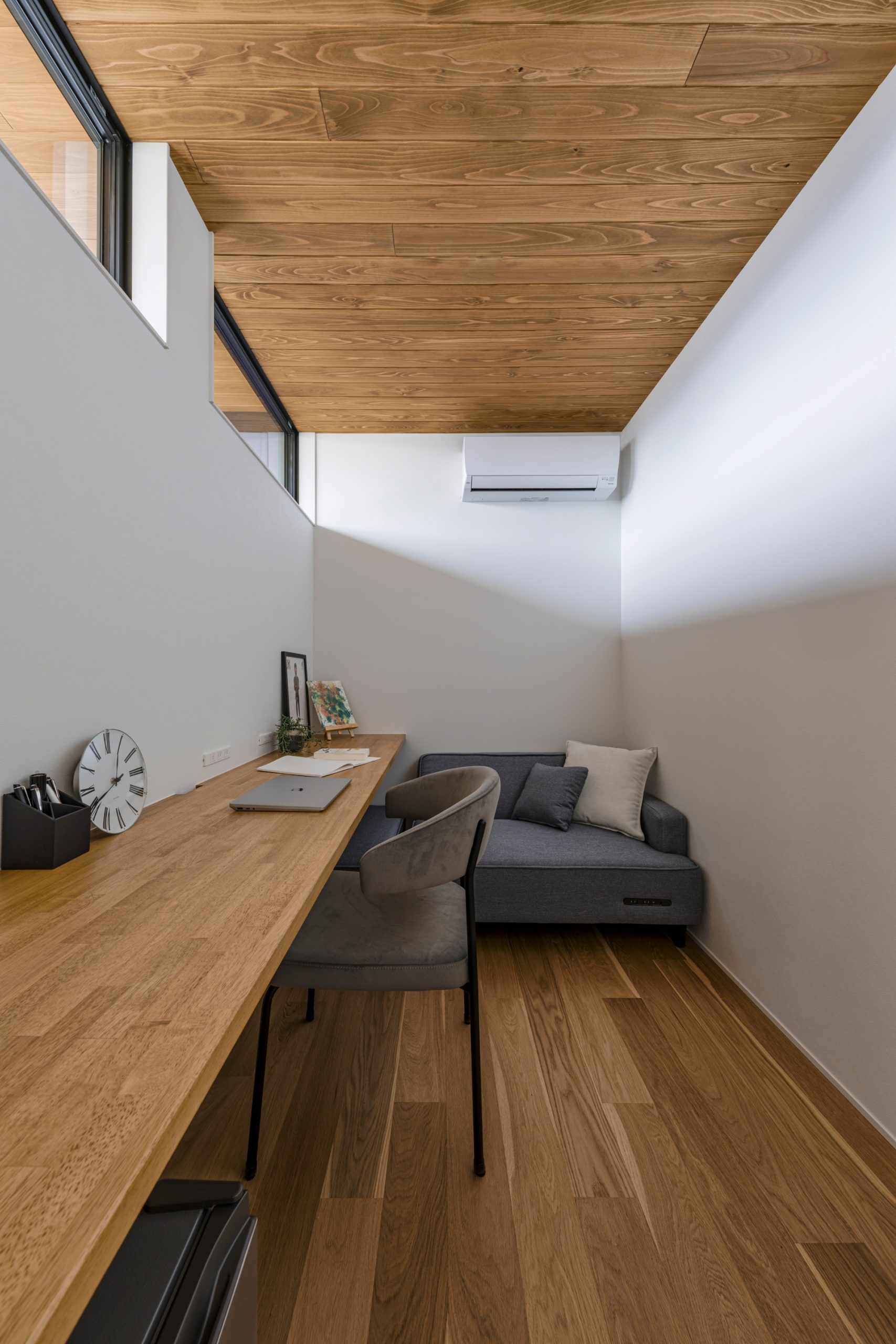 リモートワーク用に設けたご主人のワークスペース。ハイサイド窓の採光が視線を遮りながらも穏やかな明るさをもたらし、リビングや主寝室から距離をとった配置が集中できる環境を整える。