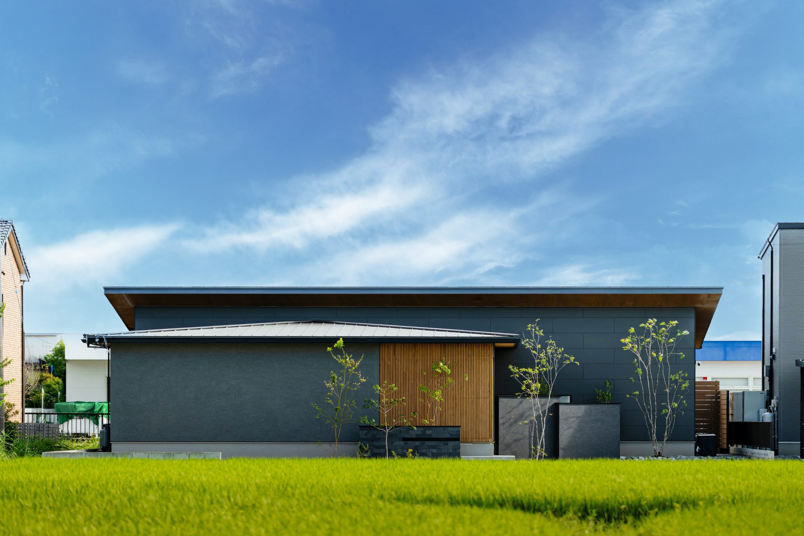 屋根の水平ラインを意識して設計した、重心の低い外観。黒×黒の配色で統一し、落ち着きのある佇まいに仕上げた。軒天まで伸びる格子の木目が和の趣を添える。