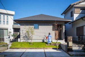 BBQがお好きなH様邸。分譲地でも周りを気にすることなく自宅BBQができるようにとコの字でお庭を囲み、目隠しフェンスでプライベート空間を充実させた。室内はカーテンを閉めると落ち着いた雰囲気にあるが、中庭に面した大きな窓を開けると明るい光がたくさん降り注ぐ明るいお家となっている。「広く見せる設計」が光り、延床20坪台とは思えない素敵なお家が完成した。