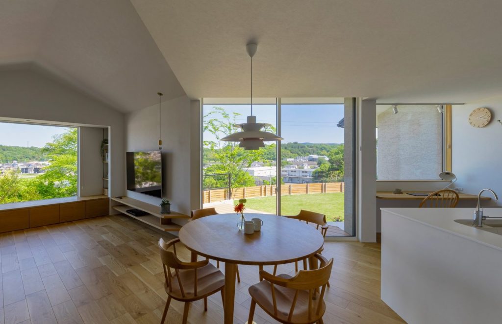 木をふんだんに使ったダイニング空間。天井付けの窓が優しい光を取り込む。