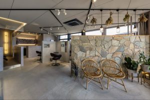 通り沿いに配置したカットスペース。大きな窓からは明るい光が差し込み、気分も上がりそう!パーテーションとしても使用可能な木の枠で製作した鏡は、可動式なので配置換えも楽々。